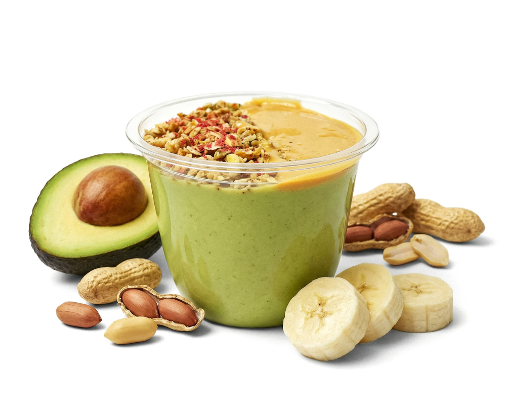 Green Power Bowl je pre tých, čo chcú viac než len sladkú chuť. Banán, avokádo a špenát dodajú stabilnú energiu bez sugar crashu. Ovos, arašidové maslo a chrumkavé musli sa postarajú o sýtosť.